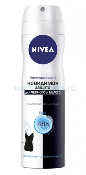 Део-спрей Nivea "Невидимая защита для черного и белого" - это прекрасный помощник для женщин в борьбе за ощущение свежести и комфорта в течение дня. Имеет легкий свежий аромат. В его состав входят специальные компоненты, которые обеспечат действие дезодоранта и не дадут неприятному запаху испортить настроение в течение 48 часов, а особая формула подарит коже мягкий уход. Уникальное отличие этого део-спрея в том, что он не оставляет белых следов на чёрной одежде и предотвращает появление желтых пятен на белой. Део-спрей Nivea не содержит спирт и красители.