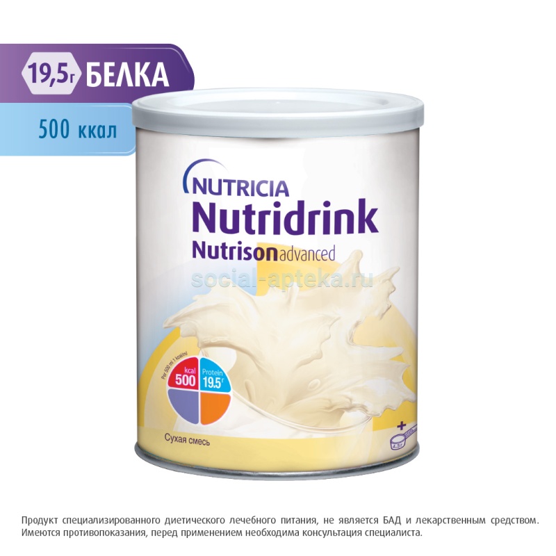 Может использоваться как дополнение к рациону или в качестве единственного источника питания. Разводить непосредственно перед употреблением. Использовать только питьевую кипяченую воду. Применять готовую смесь комнатной температуры или подогретую (не выше 38° С). Не добавлять к смеси лекарства и другие вещества. Промывать зонд и менять систему введения каждые четыре часа. Начатую банку плотно закрывать пластиковой крышкой сразу после использования. Суточное количество, вид разведения, способ и скорость введения питания определяет врач. Ориентировочно, взрослому человеку требуется 0,7-2 банки Нутридринк Эдванс Нутризон в сутки в случае единственного источника питания. Рекомендуемая скорость зондового введения 0,25-1,5 мл/кг/час, в зависимости от функционального состояния ЖКТ. Подробная инструкция к Нутридринк Эдванс Нутризон прилагается к продукту. Можно применять через рот в виде напитка, медленно, небольшими глотками, или добавлять в приготовленную пищу, например кашу, творог, суп. Внимание! Готовую смесь не кипятить! При взаимодействии с лекарственными средствами возможно свертывание в пищеварительном тракте. Принимать под наблюдением врача. Разведение сухой смеси Мерная ложка на 4,3г порошка находится внутри банки. Разводить непосредственно перед употреблением. Использовать только питьевую кипяченую воду. Калорийность готовой смеси Соотношение ложки/вода Изокалорическое (стандартное) разведение 1ккал в 1мл на 500мл ложек (шт) 25 воды (мл) 425 Гиперкалорическое разведение 1,5ккал в 1мл на 100мл ложек (шт) 7,5 воды (мл) 77,5 на 500мл ложек (шт) 38 воды (мл) 387 Налейте требуемое количество воды комнатной температуры в стерильную емкость. С помощью прилагаемой мерной ложки добавьте соответствующее количество порошка. Следите за равномерностью заполнения ложки (не выше краев) - излишки следует вернуть обратно в банку. Не добавляйте к смеси лекарства и другие вещества. Размешайте до полного растворения порошка. Готовую смесь не кипятить! и не разогревать выше 38 градусов. Применять через рот в виде напитка, небольшими глотками, медленно или с помощью зонда. При зондовом введении рекомендованная скорость 0.25-1.5мл/кг/час, в зависимости от функциональной адаптивности ЖКТ. Следует промывать зонд и менять систему введения через каждые 4 часа. Открытую банку плотно закрывать пластиковой крышкой сразу после использования. Суточное количество, вид разведения, способ и скорость введения питания определяет специалист.