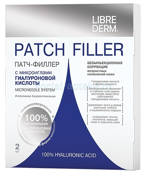 Механизм действия: На поверхности патча-филлера LIBREDERM® расположены 130 микроигл из биорастворимой гиалуроновой кислоты. Во время нанесения микроиглы безболезненно прокалывают поверхностный слой кожи, позволяя гиалуроновой кислоте проникать на глубину 350 микрон. Микроиглы выполнены из биорастворимой гиалуроновой кислоты. Через 3-4 часа иглы полностью растворяются, наполняя кожу изнутри активными компонентами. ПРЕИМУЩЕСТВА: — дорогостоящую салонную процедуру можно делать в домашних условиях совершенно безопасно — содержит 100% натуральную гиалуроновую кислоту — инновационная технологи интенсивной биоревитализации за счет 130 микроигл биорастворимой гиалуроновой кислоты — доставка активных компонентов в глубокие слои кожи — уменьшает глубину и выраженность морщин — безынъекционная коррекция возрастных изменений без болезненных косметических процедур — не содержит парабенов красителей и консервантов — патч-филлеры специально разработаны с учетом анатомических особенностей областей вокруг глаз и носогубных складок — можно использовать ночью во время сна — прост и удобен для самостоятельного использования — нет аналогов в аптеке