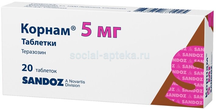 При одновременном применении Корнама и бета-адреноблокаторов, диуретиков, блокаторов кальциевых каналов, ингибиторов АПФ антигипертензивный эффект может усиливаться. Требуется особая осторожность при одновременном назначении теразозина и антигипертензивных препаратов центрального действия.Всасывание теразозина снижается при одновременном приеме адсорбентов и антацидов.Адреномиметики ослабляют эффект теразозина.При одновременном применении теразозина и НПВС возможно снижение антигипертензивного действия вследствие подавления синтеза простагландинов и задержки жидкости и ионов натрия.