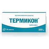 Тербинафин относится к группе аллиламинов, обладает широким спектром противогрибкового действия. В низких концентрациях оказывает фунгицидное действиe на дерматофиты Trychophyton (Т. rubrum, Т. mentagrophytes, Т. tonsurans, T.verruсosum, T.violaceum), Microsporum canis, Epidermophyton floccosum, плесневые грибы (напр. Scopulariopsis brevicaulis), дрожжевые грибы, главным образом Candida albicans. На грибы Candida spp. и их мицелиальные формы оказывает в зависимости от вида гриба фунгицидное или фунгистатическое действие. Тербинафин нарушает ранний этап биосинтеза основного компонента клеточной мембраны гриба эргостерола путем ингибирования фермента скваленэпоксидазы. При пероральном применении не эффективен при лечении разноцветного лишая, вызванного Pityrosрorum ovale, Pityrosporum orbiculare, Malassezia furfur.Фармакокинетика При пероральном приеме хорошо абсорбируется, через 0,8 часа абсорбируется половина принятой дозы; через 4,6 часа половина принятой дозы распределяется в организме. Через 1–2 часа после приема внутрь однократной дозы 250 мг максимальная концентрация препарата в плазме крови достигает 0,97 мкг/мл. Биодоступность составляет 80%. Прием пищи не влияет на биодоступность тербинафина. Тербинафин интенсивно связывается с белками плазмы крови (99%), быстро распределяется в тканях, проникает в дермальный слой кожи и ногтевые пластинки. Проникает в секрет сальных желез и накапливается в высоких концентрациях в волосяных фолликулах, в волосах, коже и подкожной клетчатке. Период полувыведения составляет 16–18 ч, период полувыведения терминальной фазы — 200–400 ч. Биотрансформируется в печени до неактивных метаболитов. Почками в виде метаболитов выводится 80% принятой дозы, остальная часть (20%) выводится через кишечник. Не кумулирует в организме. Возраст больных не влияет на фармакокинетику тербинафина, однако элиминация может снижаться при поражениях почек или печени, приводя к высоким концентрациям тербинафина в крови. Выделяется с грудным молоком.